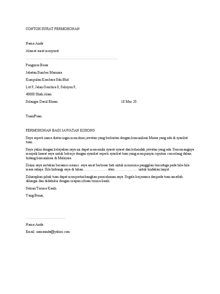 Contoh surat mohon kerja bahasa inggris 13 february 2022. Simak beberapa contoh surat permohonan di bawah ini. Permulaan Pertengahan Penutup Permulaan Bahagian ini anda memperihalkan tentang memperkenalkan diri dan menjelaskan sebab kenapa anda menulis.